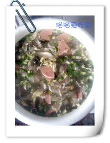 食材:面粉 、平菇、紫菜、火腿肠、 鸡蛋 、 姜、葱、 香菜。