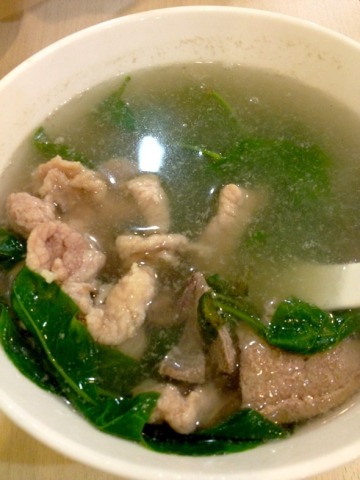 原料:猪肝二两,猪粉肠二两,瘦肉三两,枸杞叶若干