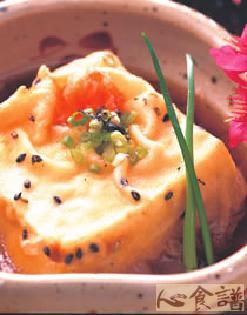 3.将炸好的芝麻豆腐放入调好的汤汁内,放上辣椒萝卜泥,洒上海苔丝、细葱末即可。