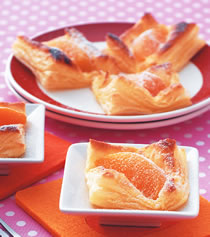 1.市售起酥片与罐头水蜜桃,每片分别切成四小片,接着分别将每片水蜜桃放置在每片起酥片上,共十二份。