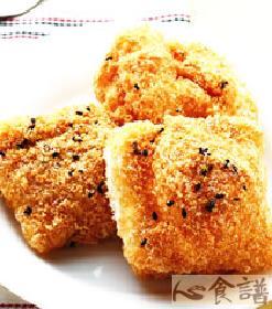 4.热油锅至油温约180℃,放入作法3的吐司块炸至表面呈金黄色捞出,沾上作法2的花生芝麻糖粉即可。