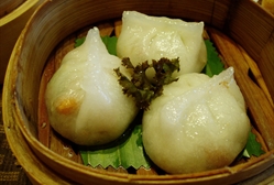 (3)将水晶皮面糰平均分切成12份,每份30公克,用桿面棍桿成圆片状。将内馅材料(3)与作法(2)拌匀,再分成12份,在水晶皮中间包入1份,用手捏紧四周,放入蒸笼中,用大火蒸约8分钟即可。