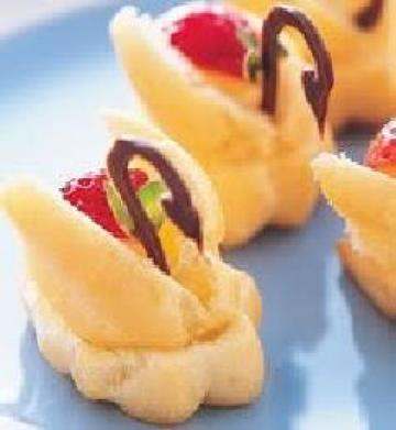 8.再將草莓洗淨後,並擦拭乾水份去掉蒂頭後,再切成四分之一,放置於作法6的天鵝身體裡的卡士達餡上做裝飾即完成。