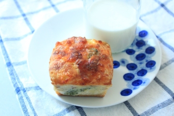 5、将鸡蛋打入一个大碗中打散,加入牛奶、面粉、泡打粉和50克奶酪碎,搅拌均匀。