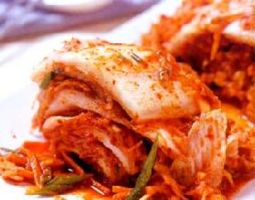 2.晾凉后的江米水中加入盐、姜蒜泥、辣椒面、梨茸调成酱,一层一层抹在大白菜上,放置3-4天即成泡菜。