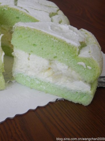 6.打发奶油,抹在蛋糕片上约1公分的厚度,接着再抹一层奶油如山丘状,最后盖上另一蛋糕片。