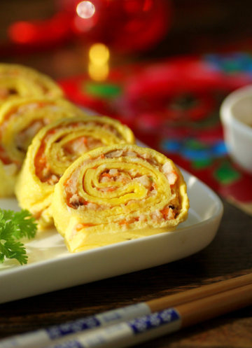 10、从一侧轻轻的卷起,尽量卷得紧一起,放入蒸锅,大火煮开上汽后,用中火蒸8分钟即可。(如想保持虾卷在蒸的时候不变形,可以高温加热的保鲜膜将蛋卷裹起再蒸)