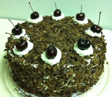 13.最后,在蛋糕顶部和周围涂上一层奶油,粘上一层巧克力屑,再在顶部装饰上樱桃,就完成了。粘巧克力屑时,不要用手,会化掉。