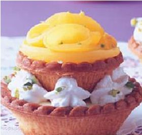 水蜜桃果泥167公克,细砂糖83公克,吉利丁片9公克,白兰地酒16公克,动物性鲜奶油225公克,塔皮数个