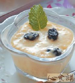 4.待作法3的布丁液冷却后撒上葡萄干,将布丁模型移入冰箱冷藏至布丁液凝固即可。