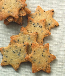 3.待冻硬后取出,用星型压模压出小片状,排放入烤盘中,入炉烤焙,以上火200℃、下火180℃,烤焙约20分钟,呈金黄色即可。