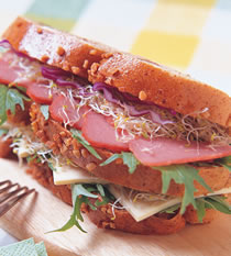 2.将面包抹上适量美乃滋,相间排入京都小菜、起司、火腿、苜蓿芽、紫高丽等材料,并组合好。