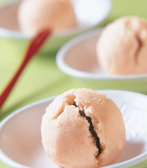 3.将做法二的面团分成每个20克,搓圆后压扁,再包入每个15克的搓圆红豆粒馅,再整成圆球形外观即可。