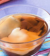4.取一碗,将作法3的巧克力布丁豆花舀小片放入碗中,再加入特制糖水即可。
