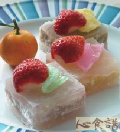 2.将3片大福皮分别抹上红豆沙、绿豆沙、芋头泥后抹上一层桂花酱,再取另外3片大福皮叠上压平,依序切块排盘,上方再放上蒟蒻和作法1的草莓片装饰即可。