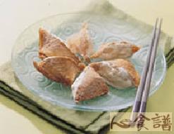 1.)将寿司皮的水份沥干,再用手轻轻将寿司皮拉开成三角袋形状,用小汤匙将香草冰淇淋盛入,每做一个立即放入冷冻继续冰冻,依序做好放入冷冻库冰冻,食用前再取出排盘。