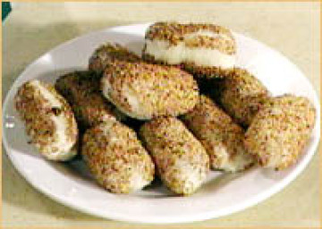 4、用面包糠将起司包起来(连头和尾部也必须沾满,以免油炸过程中起司外泄);