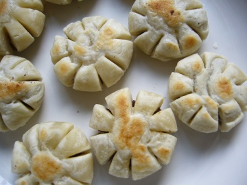 包入馅料,收口,压扁.然后用剪刀剪出4-5个切口做成花瓣酥.也可剪8-12个切口,然后将剪开的花瓣折一下露出里面的馅,做成菊花酥.