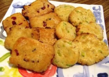 低筋面粉195克(all purpose flour 195克),baking powder 1/2 tsp, 蛋黄3个,奶粉12克(coffeemate 12克),黄油80克,细砂糖70克,葡萄干80克(切碎的 dry cranberry 或者切碎的葱花, 熟芝麻和少许盐).