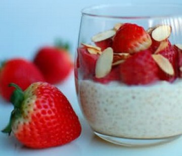 1.5杯牛奶/whole milk;1/2杯鲜奶油/heavy cream;1小勺香草精/vanilla extract;1.5大勺糖;一小撮盐/pinch of salt;1/2杯quinoa;草莓若干;糖若干(用于腌渍草莓);烤香的杏仁片若干