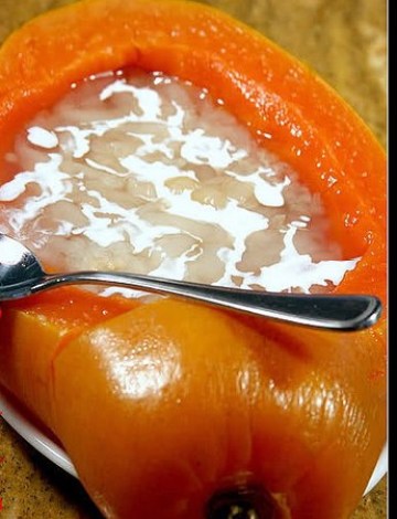 4.木瓜冼干净外皮,在顶部切出2/5作盖,挖出核和瓤,木瓜放入炖盅内,注入煲好的雪蛤膏,加盖,用牙签插实木瓜盖,隔水炖一小时即可。