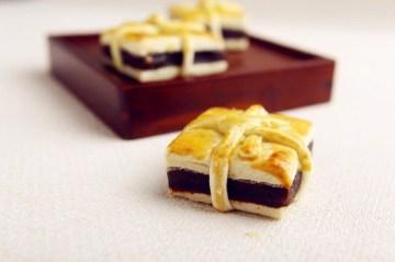 12.将切好的细条以十字架的形式捆绑在正方形枣泥块上,接头放在上面