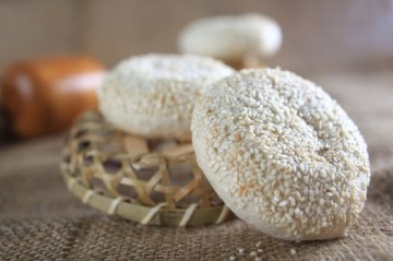 6.接口向下压扁,在表面刷上水,沾上少许芝麻