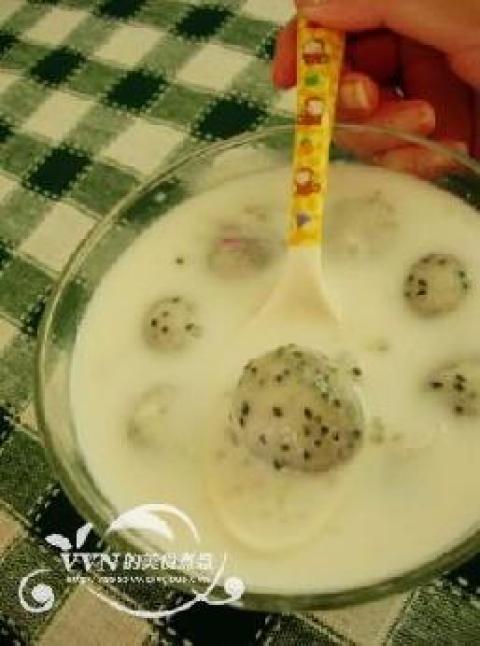 4、把椰汁倒入碗里,放上切好的火龙果块和煮好的西米就可以开吃啦!