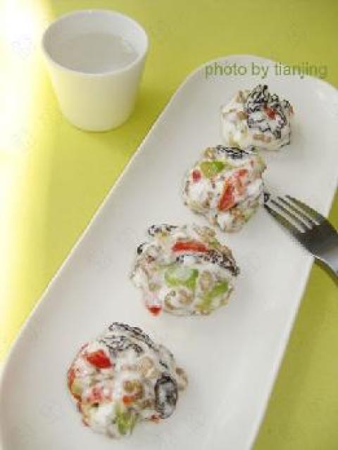 (1)将起司片切成条状。香蕉、凤梨片、哈密瓜片、奇异果片都切成小丁,和美乃滋、起士条一起拌匀。