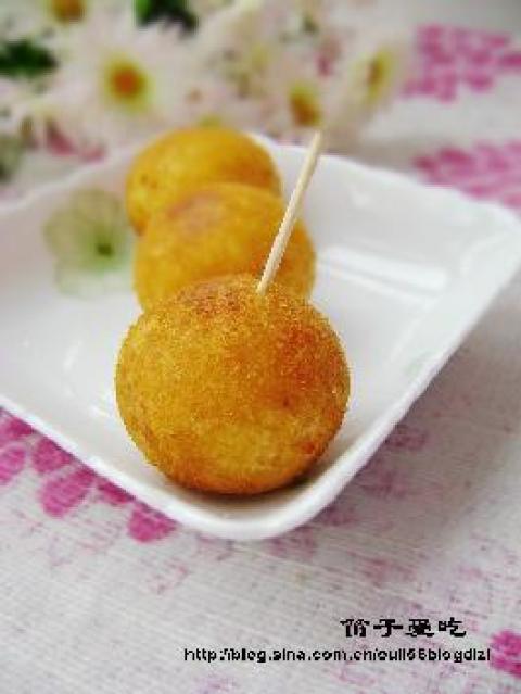 5.可以煮着吃,还可以把南瓜汤圆表面沾点面包糠油锅烧至七成热,下圆子,中火炸熟。