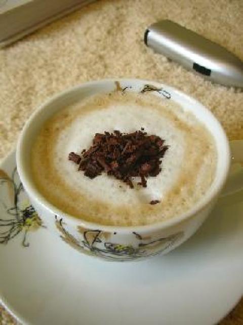 4.咖啡杯用开水温热后倒约1/3的咖啡,倒入泡沫牛奶,最后撒上巧克力碎。