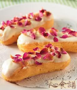 a.沙拉油119公克,水424公克,盐7公克,奶油136公克,b.高筋面粉339公克,c.全蛋611公克,d.法式布丁馅适量,白巧克力适量,干燥玫瑰花瓣适量