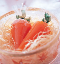 3.待作法2的果冻液稍凉后,倒入三明治塑胶袋中,用橡皮筋绑成胡萝卜状,冷却后再打开塑胶袋,就成为健康又可爱的胡萝卜果冻了。