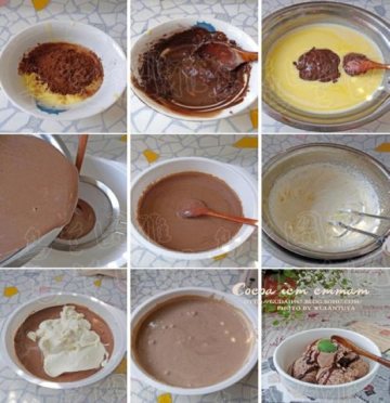 4、再把经过煮沸的巧克力牛奶慢慢倒入糖与蛋黄的混合物中,搅拌均匀。等冷却后倒入准备好的盆内入冰箱冷冻,即成。