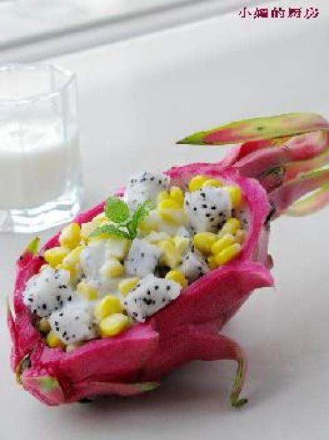 2.玉米洗干净,煮熟,过冷水(矿泉水或纯净水),捞出来,沥干水。把玉米和火龙果丁混合,倒上酸奶,拌匀,放回火龙果做的容器里即可