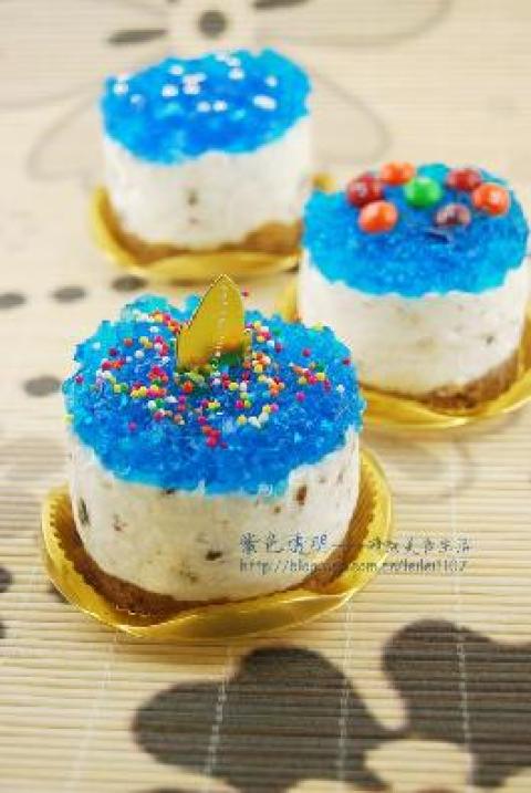蓝色酒冻:,蓝橙酒80ml,水40ml,糖20克,吉利丁1片,酸奶葡萄干迷你慕斯:,酸奶150克,淡奶油100ml,黄油20克,白砂糖20克,消化饼干6片,吉利丁1片,柠檬汁10克,葡萄干适量