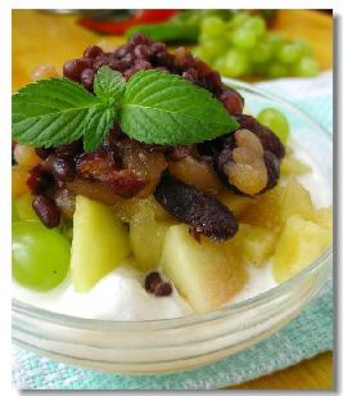 2.喜欢的鲜果切成小丁,撒在奶冰沙上。最后再撒上红豆沙即可。