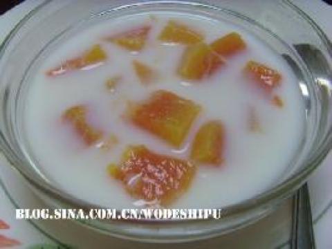 3.至木瓜块煮熟,变色(变成橘红色)盛起;盛有木瓜的碗中倒入牛奶,搅拌即可食用。