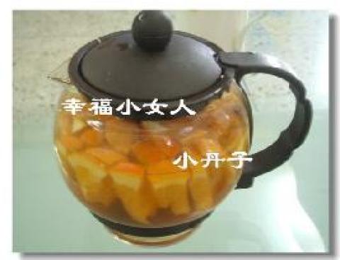 1.鲜橙洗净,连皮切成大块,装入玻璃茶壶,