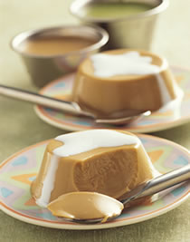 (3)另1等份鲜奶果冻液加入抹茶粉拌匀,依作法(2)步骤亦分别加入蛋黄及鲜奶油拌匀,过筛后即可倒入布丁杯模型中,冷藏凝结后即为抹茶牛奶布丁。