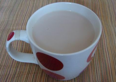 3、最后将绿豆茶汁中加入热牛奶,搅拌均匀。
