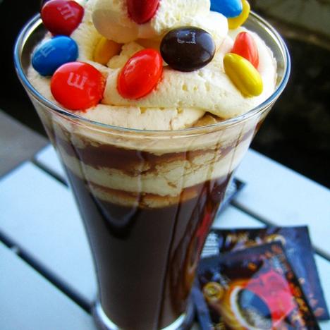 3、将混合好的咖啡倒入杯中,表面挤满打发的淡奶油,撒上mm巧克力豆装饰即可。