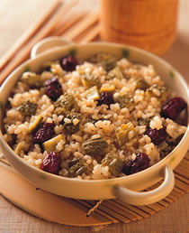3.)将糙米洗净,加入水浸泡2小时,再加入山苦瓜丁、红枣及所有调味料,稍微拌一下,让调味料均匀溶入米中。