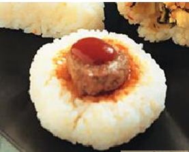 4.双手沾盐水,将少许白饭置于掌心并涂抹少许蕃茄酱,放一块汉堡肉,再在肉上涂抹蕃茄酱,然后覆盖少许白饭捏成饭团即可。