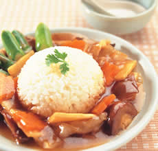 2. 热油锅,加入水及作法1的材料与调味料b煮至滚沸,将太白粉水慢慢倒入锅中勾芡,再滴入香油即可起锅,淋在白饭上即可食用。