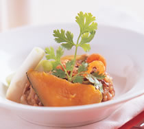 2.热油锅,放入虾米爆香,再加入葱段爆香,南瓜块下锅以大火炒至变色,加入调味料拌炒至滚开,转小火后加入蒸好的五榖饭拌炒至收汁、南瓜熟透即可。