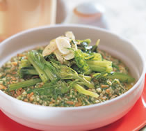3.热油锅,放入蒸熟的燕麦和小米,将鸡高汤分3次加入,边加边拌匀,用大火拌炒至收汁,加入荳蔻、盐和绵白细糖调味后,拌入作法2的菠菜泥和菠菜梗,淋上橄榄油,转小火拌匀即可。