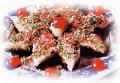 (2)木框放在案板上,取紫米饭入框压平去框。复将糯米饭入框压平,取出框。在紫米饭和糯米饭的面上都刷上玫瑰糖,再合二为一,玫瑰糖面夹在中间。面上撒上熟芝麻和蜜饯未,用刀切成菱形块装盘。