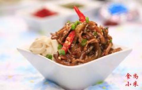 2、肉丝用、盐、绍酒、鸡蛋清、水淀粉抓匀打上少许生油;
