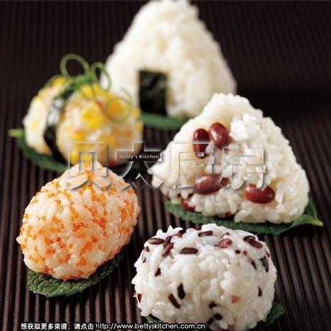 日本紫菜1张,寿司饭1碗,冷开水1碗,盐1/2茶匙(3g),红豆,火腿丁,紫米,玉米粒,新鲜蟹籽,新鲜鱼籽